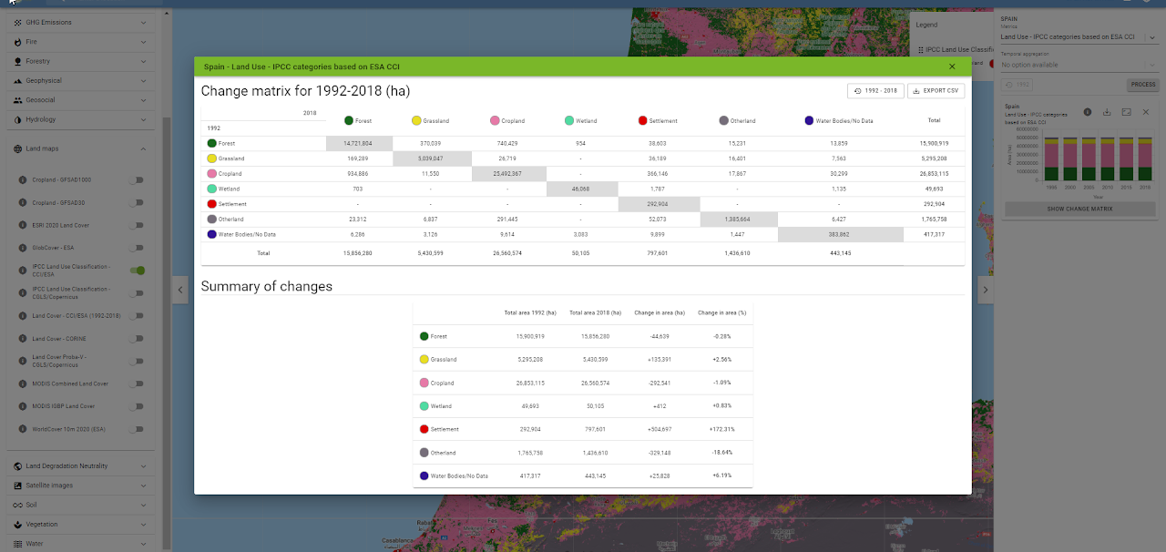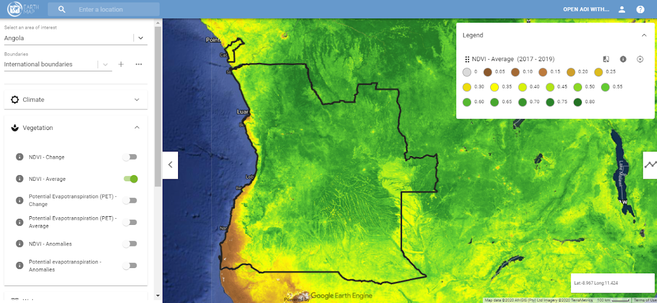 Earth Map brings together publicly available datasets, including satellite imagery (e.g., Landsat, Sentinel), climate records, vegetation indices, and land cover maps. These are organized into thematic groups such as Forestry, Climate, Vegetation, Land Degradation, and Biodiversity for easier access and interpretation.